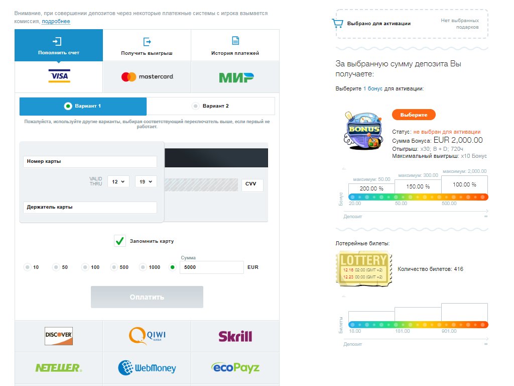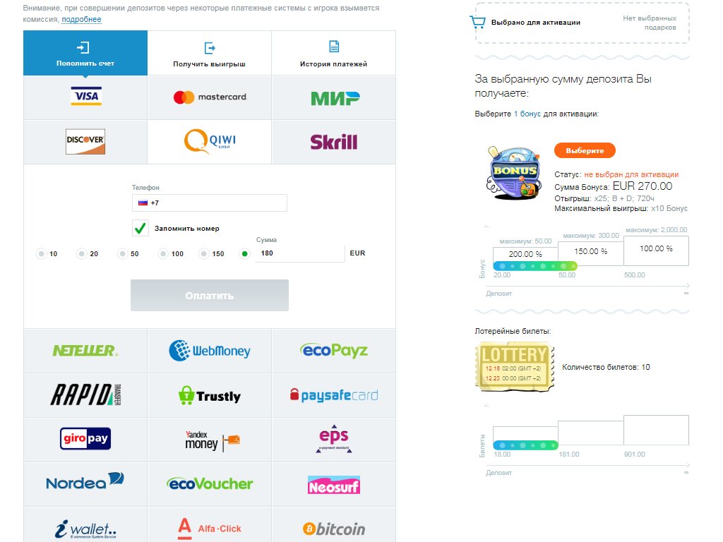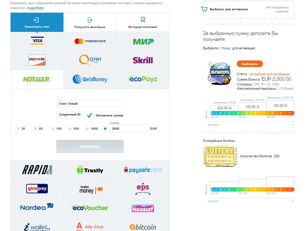 Суммарно, вновь зарегистрированный игрок имеет возможность активировать за первые пять взносов на игровой баланс — 425% к сумме пополнений (в общей сложности до 2 000 евро).